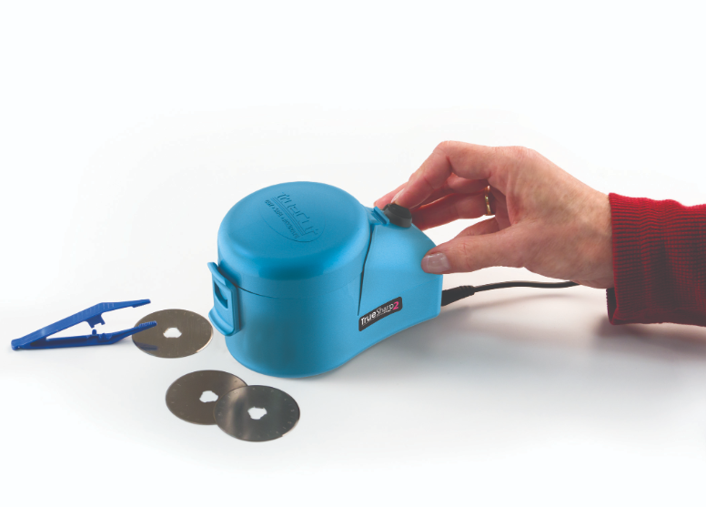 The TrueSharp Power Sharpener sharpens your blades with the push of a button. Make quick work of sharpening 28mm, 45mm, and 60mm rotary blades with the TrueSharp's high quality sharpening stones.